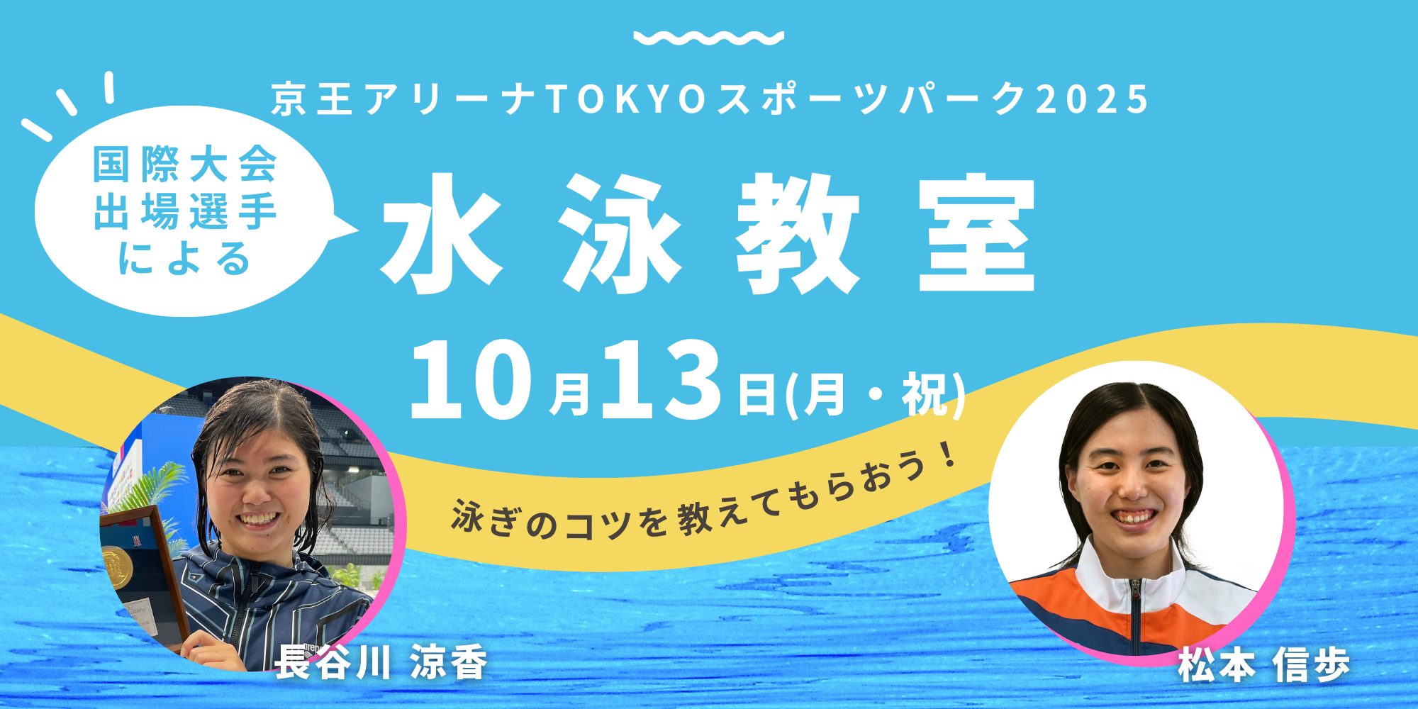 オリンピックに出場した長谷川 涼香 選手と松本 信歩 選手によるデモンストレーションと個々の泳力に合わせた直接指導を行います。